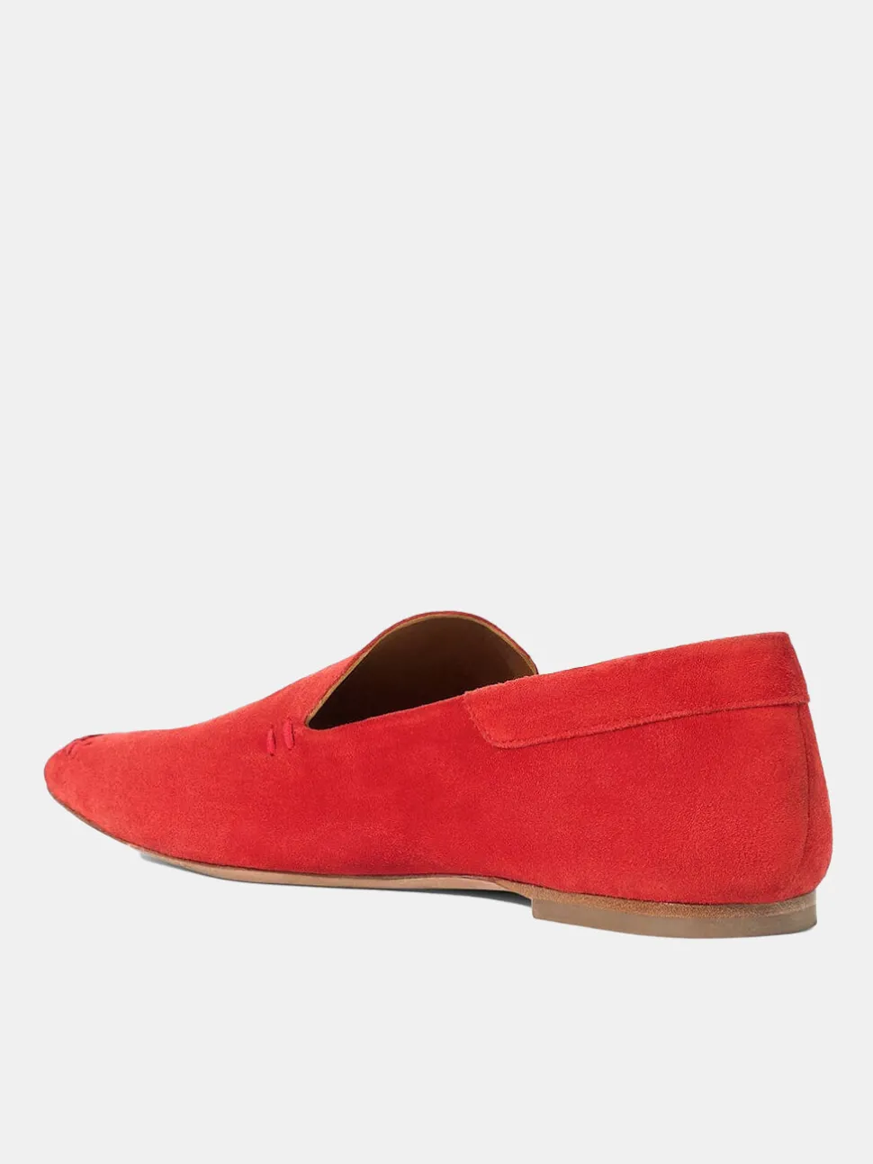 The Becks Soft Loafer by Staud features a slip-on style, a supple suede upper and a leather sole. Shown in Dune and Chili.
