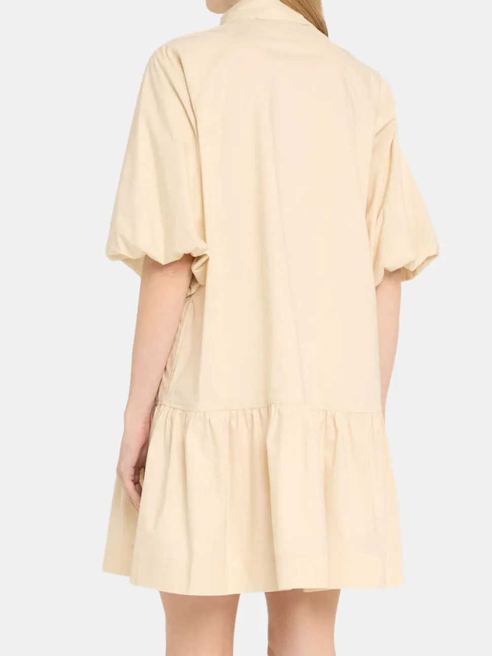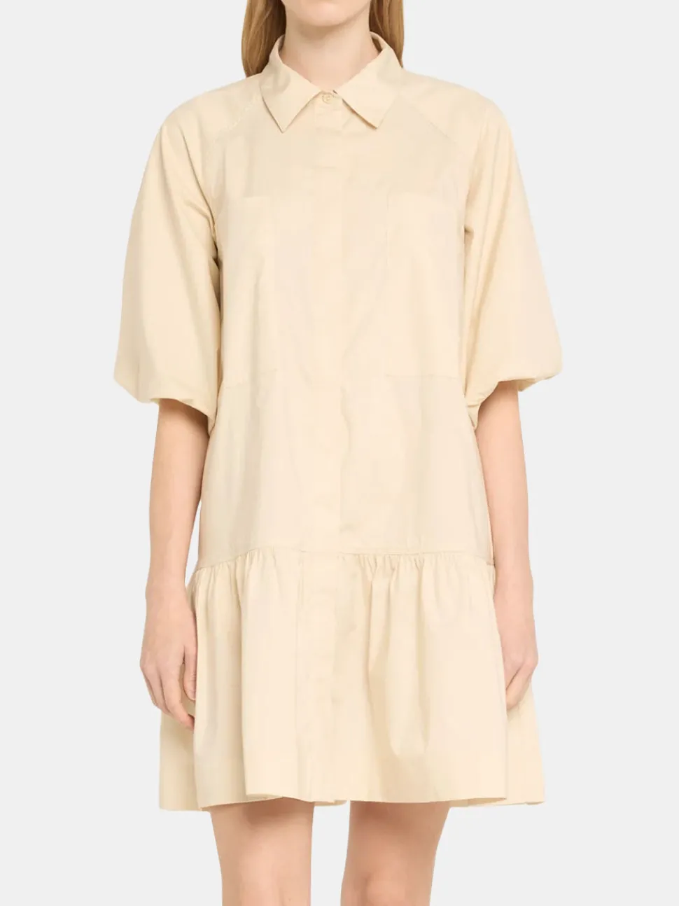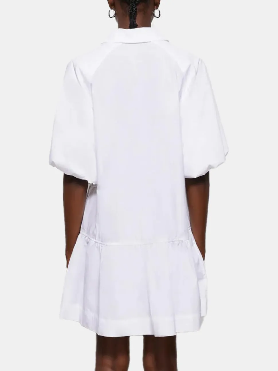 The Crissy Cotton Poplin Dress by Simkhai featuresvoluminous sleeves, tiered hem, and exaggerated chest patch pockets. Shown in Midnight, White, and Sand.